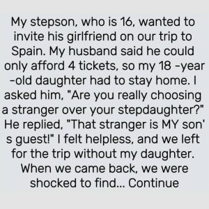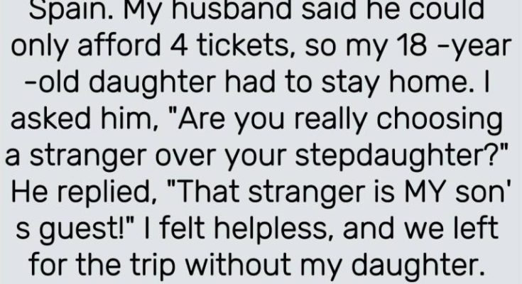 My 16 y.o. stepson wants to invite his new girlfriend on our trip to Spain. My husband agreed but said he can’t afford more than 4 tickets, so we have to leave my 18 y.o. daughter at home. I was furious and blamed him for choosing a stranger over his own stepdaughter whom he’d been raising since she was 7. He replied,